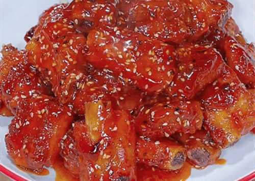 将排骨盛出装盘,撒上白芝麻点缀,即可享用。